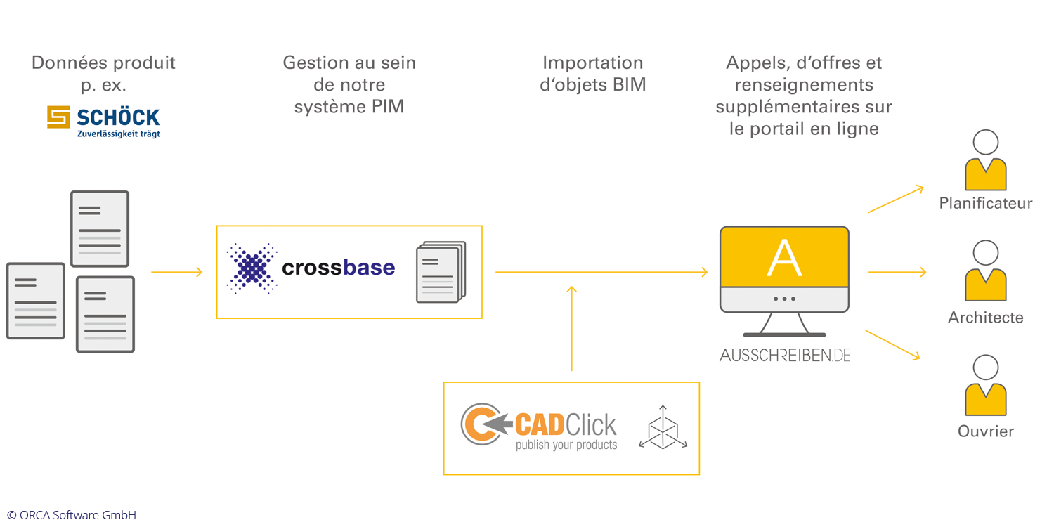 L'interaction entre tous les partenaires impliqués s'explique simplement : Schöck fournit via crossbase les produits à publier, notamment les hiérarchisations de produits, les données techniques, les images de produits, les documents et les textes pour appels d'offres. 4PACE fournit les données CAO/BIM qui peuvent être intégrées dans tous les systèmes CAO/BIM courants. AUSSCHREIBEN.DE présente ces informations de produits et ces données CAO/BIM sur sa plateforme pour les planificateurs et les architectes – le tout intégré sur une seule interface.