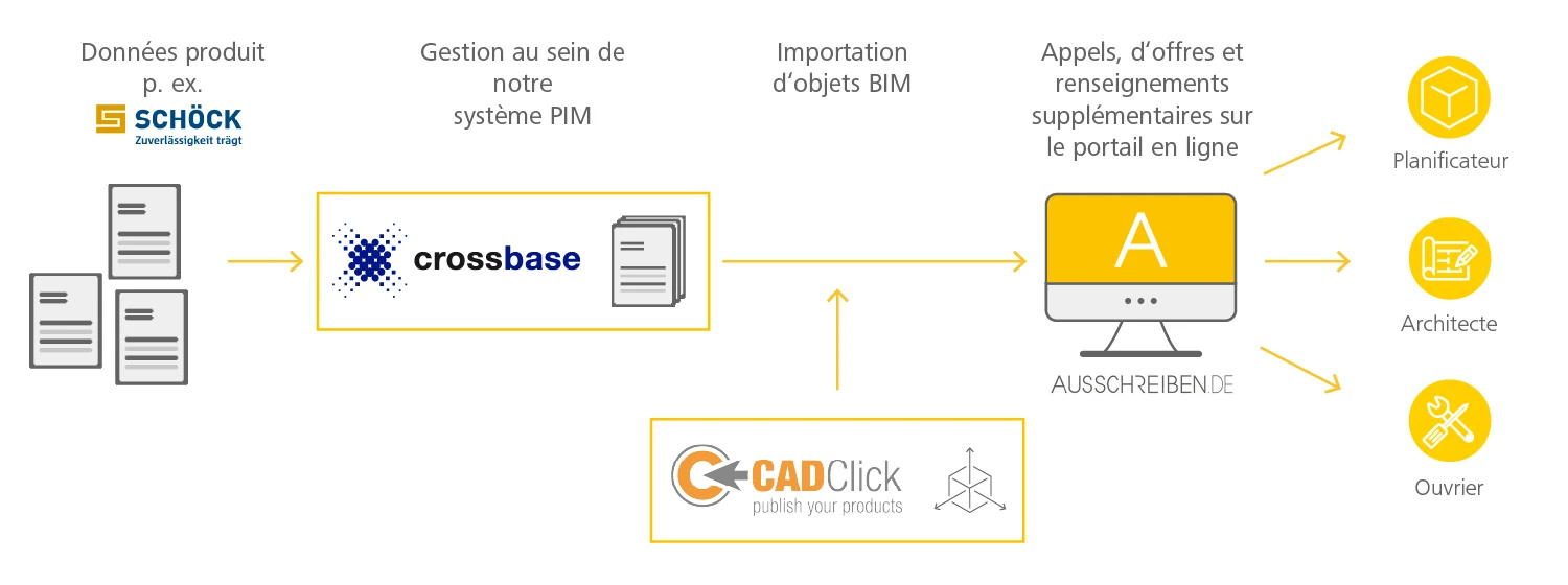 L'interaction entre tous les partenaires impliqués s'explique simplement : Schöck fournit via crossbase les produits à publier, notamment les hiérarchisations de produits, les données techniques, les images de produits, les documents et les textes pour appels d'offres. 4PACE fournit les données CAO/BIM qui peuvent être intégrées dans tous les systèmes CAO/BIM courants. AUSSCHREIBEN.DE présente ces informations de produits et ces données CAO/BIM sur sa plateforme pour les planificateurs et les architectes – le tout intégré sur une seule interface.