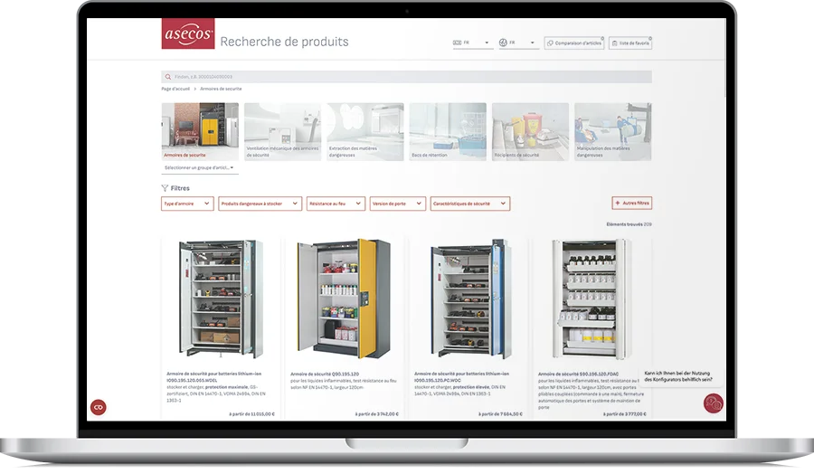 Grâce à la collaboration entre asecos et crossbase, le nouveau chercheur de produits séduit par son design moderne et son guidage optimisé de l'utilisateur, qui permet aux clients de trouver rapidement le produit qui leur convient. Une navigation guidée est également prévue pour l'avenir, ce qui rendra le processus de sélection encore plus intuitif.